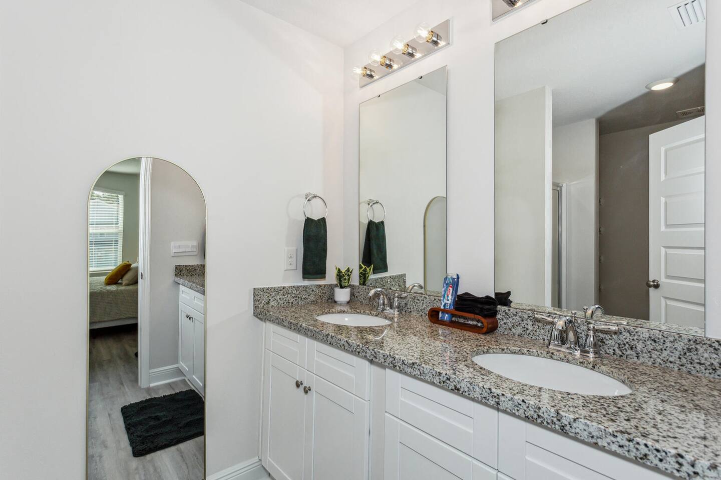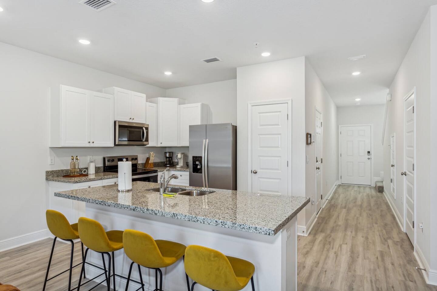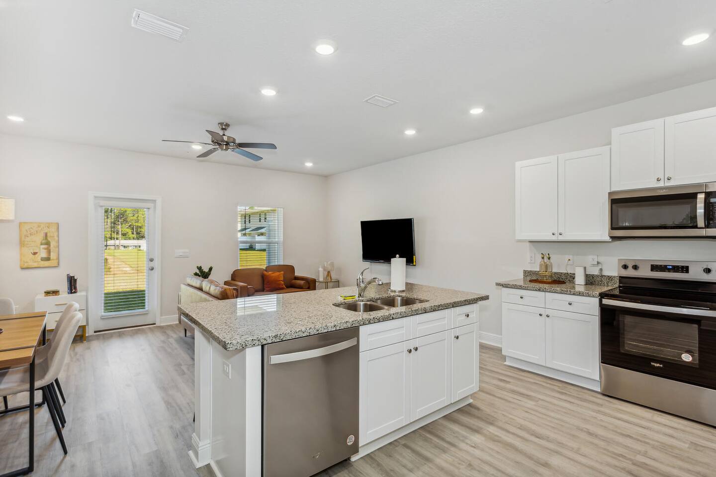 Welcome to your modern escape in Pensacola! This cozy 3-bedroom townhome combines comfort with a sleek, modern style—perfect for family vacations or group getaways. Inside, you’ll find a spacious, open-concept layout featuring a modern kitchen with granite countertops, a dining area, and a comfortable living room—ideal for gathering, cooking, and relaxing. The master suite is a true retreat with a king bed, double vanity, walk-in closet, and an adjustable-height desk for remote work convenience. The second bedroom offers a queen bed, while the third is perfect for kids or friends with two twin beds; these two rooms share a full bathroom, making it easy for everyone to refresh and recharge. For added convenience, there's an in-unit laundry with a washer and dryer—perfect for longer stays. Step out back to a private yard that opens to a serene wooded area and a peaceful pond, perfect for morning coffee or evening unwinding. Located in a friendly neighborhood with private parking, you’re just minutes away from all the best Pensacola has to offer. Book your stay and enjoy the perfect blend of comfort and modern style!